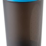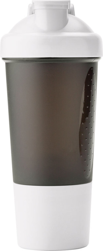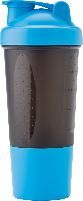 Copo agitador de proteínas em plástico (500 ml) com uma bola metálica para misturar. Inclui pontos em ambos os lados do copo para facilitar o apegue e um compartimento inferior para a proteína em pó.
